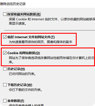 3. 選取[臨時Internet文件和網站文件]及Cookie旁的核取方塊。