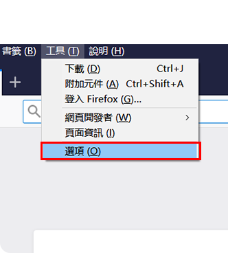 1. 在Mozilla Firefox中,按一下[工具]。如果未看到這個選單,請按一下鍵盤上的Alt鍵,即可顯示選單列。